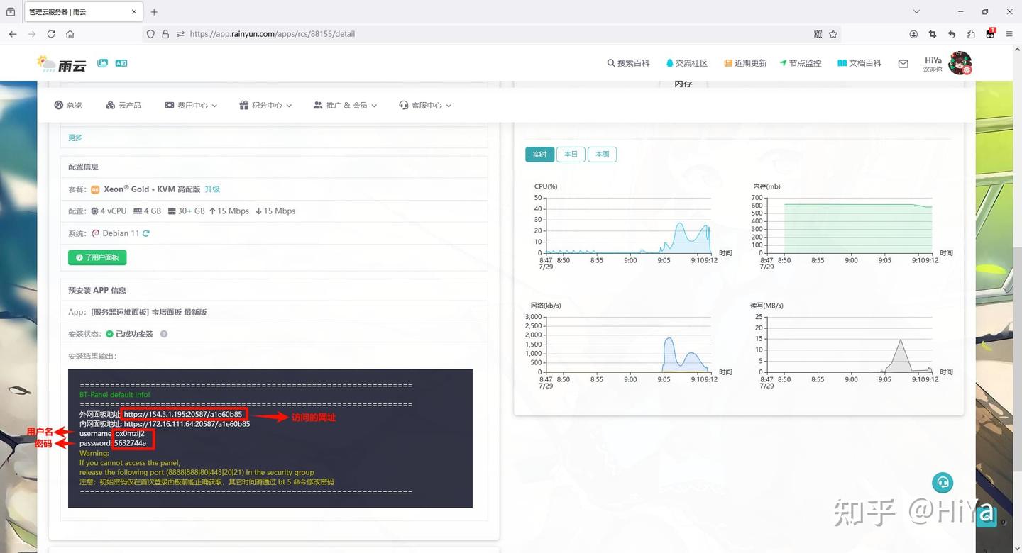 在信息与监控选项卡中,找到预安装APP信息 在安装结果输出中,找到外网面板地址,然后进入后面的网址 下面的username和password分别对应用户名和密码