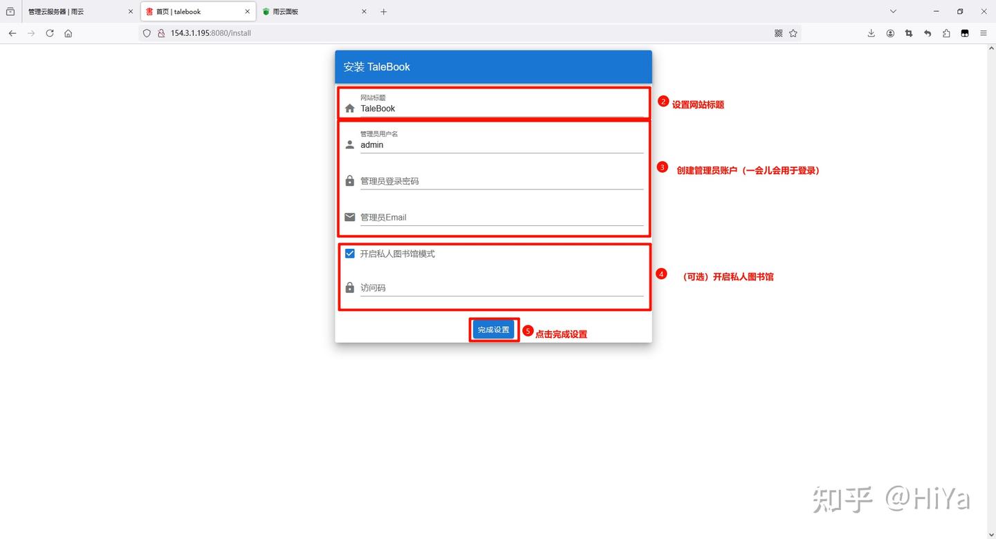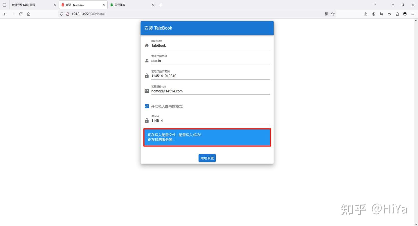 然后不出意外你应该会看到这个安装页面 如果没有看到,可以等一下,或者看一下那一步操作错误 标题随便写 用户名和密码填写一个自己记得住的 邮箱也是填自己的(如果没有邮箱可以填写你的QQ号@qq.com,也可以注册一个) 私人图书馆可以开也可以不开,如果开了一定要记住(建议访问码填数字) 然后点击完成设置