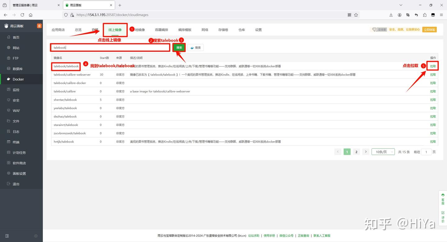 安装完成后面板可能还会提示未安装,刷新一下就可以了 接下来点击线上镜像,搜索talebook,点击搜索按钮 找到镜像名为talebook/talebook的镜像,点击拉取