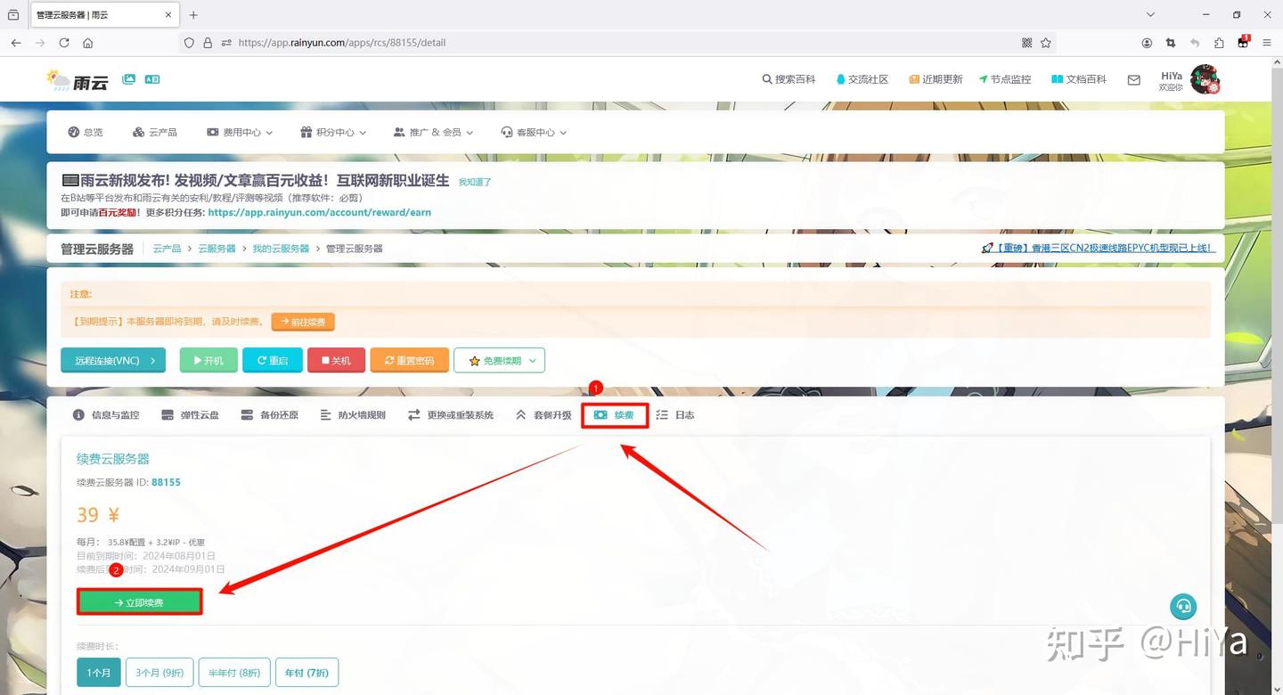 如果你的服务器快到期的话,请不要忘了在雨云的控制界面点击续费选项卡,然后续费 不然你的书将会丢失!