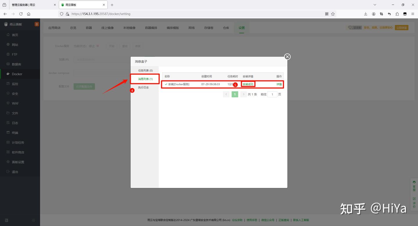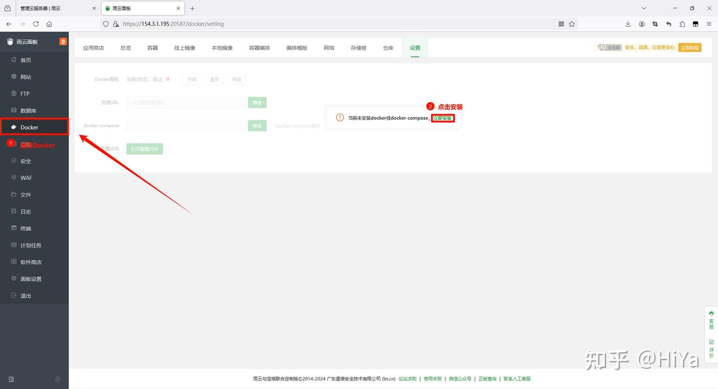 在侧边栏中选择Docker 面板会提示你未安装Docker,点击立即安装