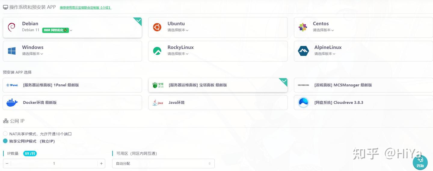 操作系统选择Debian 11 预安装APP选宝塔面板 公网IP选择独享公网IP模式(独立IP)