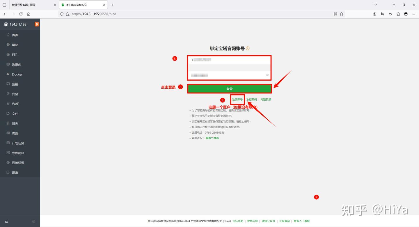接下来面板会让你绑定宝塔账号 如果你没有账号,点击下面的注册账号 然后在面板中输入手机号和密码,点击登录