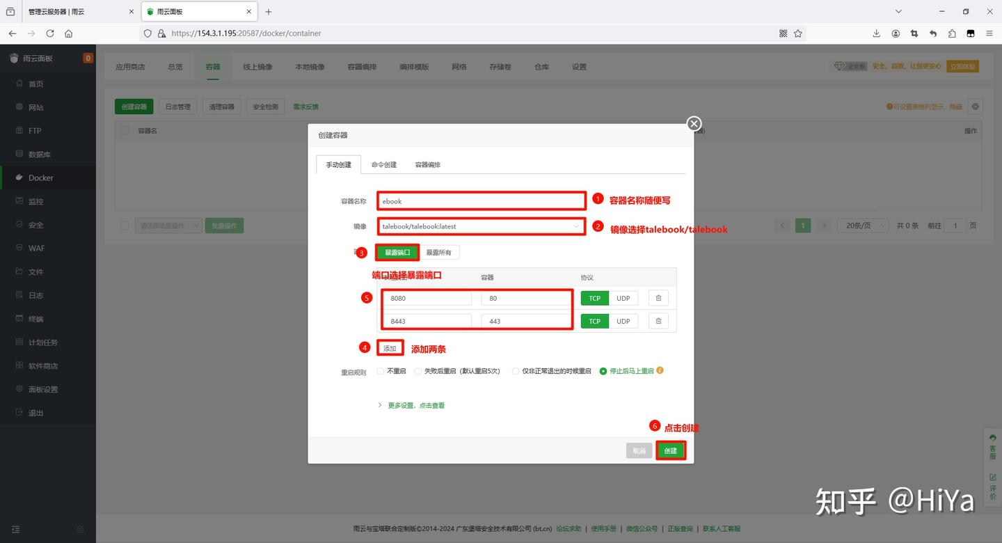 镜像名称随便写(不要含有中文,最好为全英文) 镜像选择talebook/talebook:lastest 端口选择暴露端口 点两次添加 第一条中本地填写8080,容器填写80,协议选择TCP 第二条中本地填写8443,容器填写443,协议选择TCP 其它的设置不要动 点击创建